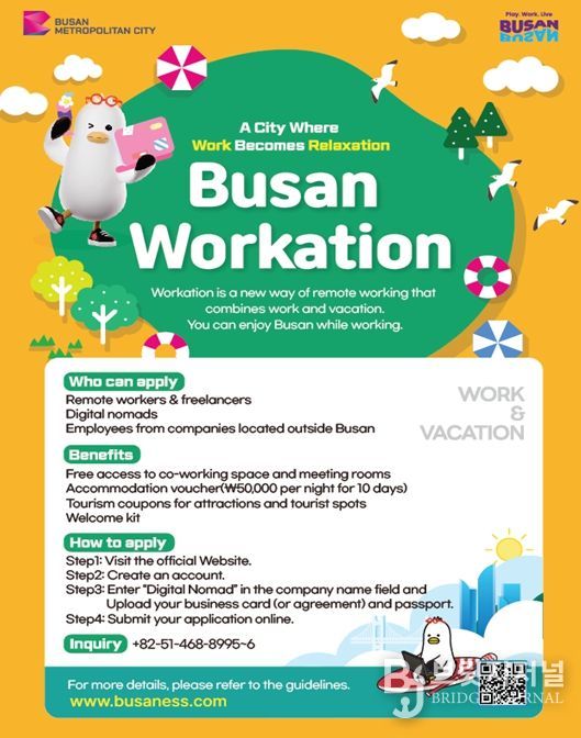 브릿지저널 윤나영 기자 | 부산시는 글로벌 온라인 여행 플랫폼(OTA)인 아고다(Agoda)와 협력하여 부산을 찾는 휴가지 원격근무(워케이션) 외국인 참여자를 위한 '부산형 워케이션 글로벌 프로모션'을 추진한다고 밝혔다.