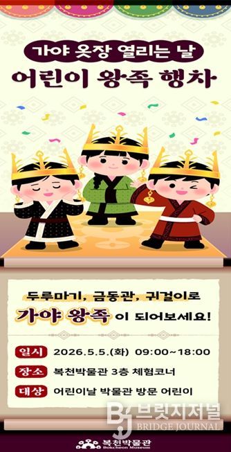 브릿지저널 윤나영 기자 | 부산시립박물관 소속 복천박물관은 오는 5월 5일 '제104회 어린이날'을 맞아 지역 아동들이 가야 문화를 친근하게 체험할 수 있는 특별 프로그램 '가야 옷장 열리는 날: 어린이 왕족 행차'를 개최한다고 밝혔다.