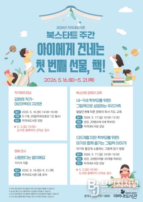 브릿지저널 윤나영 기자 | 원주시 미리내도서관은 다음 달 16일부터 21일까지 북스타트코리아와 함께 ‘아이에게 건네는 첫 번째 선물, 책!’을 주제로 북스타트 주간 프로그램을 운영한다.