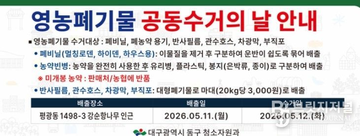 브릿지저널 김진석 기자 | 대구 동구청은 5월 27일까지 농촌지역에 영농폐기물 공동수거의 날을 지정해 운영한다.