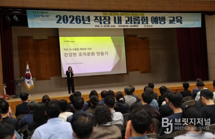 브릿지저널 정보영 기자 | 청도군은 4월 28일 국민체육센터 실내체육관에서 김동기 청도군수 권한대행을 비롯한 간부 공무원과 전 직원이 참석한 가운데 ‘2026년 직장 내 괴롭힘 예방 교육’을 실시했다.