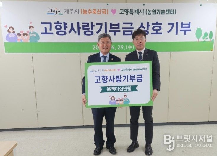 브릿지저널 정보영 기자 | 제주시는 4월 29일 고양특례시 농업기술센터에서 고양특례시와 고향사랑기부금 상호 전달식을 갖고 지역 간 상생과 협력 강화에 뜻을 모았다.