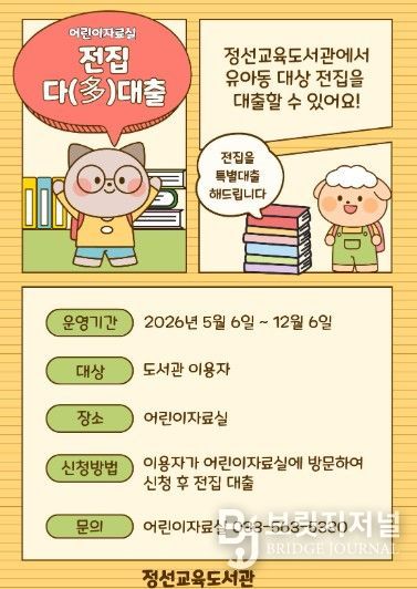 브릿지저널 윤나영 기자 | 정선교육도서관은 5월 6일부터 12월 6일까지 어린이자료실에서 어린이자료실 이용 활성화와 지역 내 독서 문화 확산을 위해 ‘전집다(多)대출’을 운영한다.