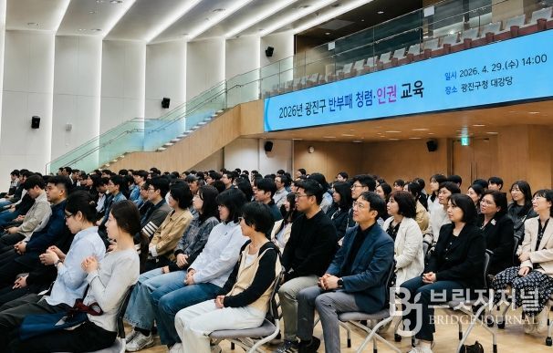 브릿지저널 김경미 기자 | 광진구가 4월 29일 광진구청 대강당에서 공직윤리 확립과 상호 존중하는 조직문화 조성을 위한 ‘반부패 청렴·인권 교육’을 실시했다.