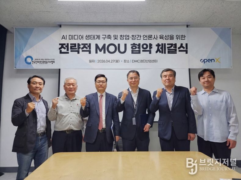브릿지저널 김경미 기자 | 한국인터넷신문방송기자협회(회장 전병길, 이하 협회)와 오픈엑스(대표 김미진)는 지난 2026년 4월 27일 서울 상암동 DMC첨단산업센터에서 업무협약(MOU)을 체결하고, 제휴 언론사 육성과 건강한 미디어 생태계 강화를 위해 적극 협력하기로 뜻을 모았다.