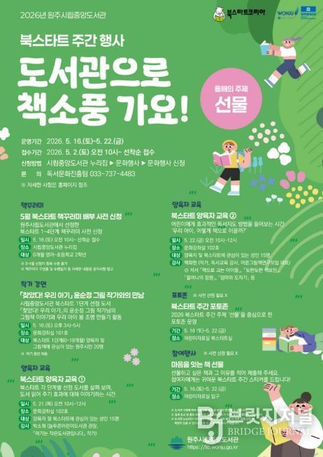 브릿지저널 윤나영 기자 | 원주시립중앙도서관은 독서문화 확산을 위해 다음 달 16일부터 22일까지 2026 북스타트 주간 행사 ‘도서관으로 책소풍 가요!’를 운영한다.