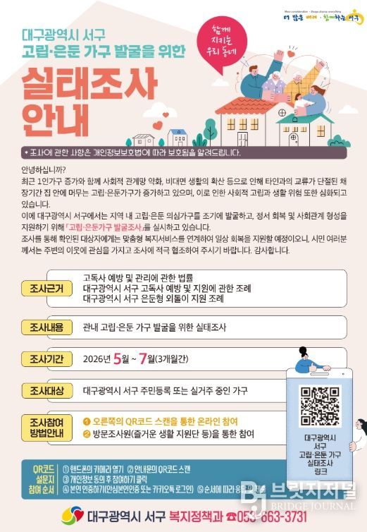 브릿지저널 김진석 기자 | 대구 서구는 사회적 관계 단절과 외출 기피 등으로 어려움을 겪는 은둔·고립 가구를 조기에 발굴하기 위해 오는 5월부터 7월까지 3개월간 지역 최초로'고립·은둔 가구 발굴 조사'를 실시한다고 밝혔다.