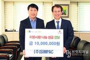 브릿지저널 김경미 기자 | 부평구는 11일 ㈜SIMPAC으로부터 연말 이웃사랑 나눔 성금 1천만원을 전달받았다. 성금은 사회복지공동모금회를 통해 지역 내 어려운 이웃에게 전달될 예정이다. ㈜SIMPAC(회장 최진식)은 부평구 청천동에 위치한 금속 및 산업기계 제조 분야의 대표적 중견기업이다. 이 기업은 지난 2012년부터 매년 1천만원 성금을 꾸준히 기탁하고 있다. 최진식 ㈜SIMPAC 회장은 “소외된 이웃을 위한 작은 정성이 모두가 따뜻한 겨울을 보내는 데 도움이 되길 바란다”며 “앞으로도 지역사회를 위한 기업의 사회적 책임을 실천하기 위해 이웃사랑 나눔을 지속적으로 이어가겠다”고 전했다. 차준택 부평구청장은 “어려운 경제 여건 속에서도 나눔을 실천해 주신 데 깊이 감사드리며, 기탁된 성금은 도움이 필요한 이웃을 위해 소중히 사용하겠다.”고 말했다.