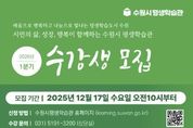 브릿지저널 김경미 기자 | 수원시평생학습관이 12월 17일 오전 10시부터 2026년 1분기 수강생을 모집한다. 1월부터 3월까지 운영되는 1분기 강좌는 ▲첨단미래기술 프로그램 ▲디지털 지식정보 프로그램 ▲생활문화 프로그램 ▲교양 프로그램 ▲인문 프로그램 ▲기관 협력 재능기부 프로그램 ▲거북이공방 프로그램 ▲대상별 맞춤프로그램 ▲시민교육 프로그램 ▲언제든학교 시민기획 프로그램 ▲무지한스승의만남 시민참여기획 프로그램 등 총 11개 과정, 115개 세부 강좌로 구성됐다. 첨단미래 기술 프로그램을 강화했다. 인공지능(AI) 기술에 초점을 둔 첨단미래기술 프로그램, 성균관대학교 지능로봇리빙랩과의 협업을 통한 자율주행 실습, 가상현실(VR)드론 시뮬레이션 체험 등이 있다. 또 글쓰기, 사주명리학, 한글 서예, 현대미술, 명화감상, 뮤지컬 등을 주제로 한 교양 프로그램과 중장년, 시니어, 제2의 인생설계, 청소년 등을 대상으로 하는 대상별 맞춤 프로그램을 마련했다. 수원시는 새빛톡톡 시민 설문조사를 활용해 2026년 강사를 공개 모집했고, ▲생활문화 프로그램 ▲디지털 지식정보 프로그램 ▲대상별 맞춤프로그램