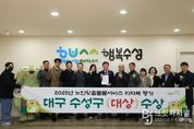 브릿지저널 김진석 기자 | 대구 수성구는 보건복지부가 실시한 2025년 ‘노인맞춤돌봄서비스 지자체 평가’에서 대상을 수상하며 ‘돌봄 공백 없는 어르신 행복 도시’의 위상을 입증했다. 수성구는 전국 229개 시군구를 대상으로 진행된 이번 평가에서 노인맞춤돌봄서비스 사업 추진 성과 전국 1위를 달성해 보건복지부 장관 기관 표창과 포상금 1,200만 원을 받았다고 밝혔다. 이번 평가는 △노인맞춤돌봄서비스 운영관리 △서비스관리(지역사회 유관 기관 네트워크 체계) △사업 성과 등 정량·정성 지표를 종합적으로 심사해 이뤄졌다. 수성구는 권역 책임제 기반의 전달체계 구축, 민관협력 네트워크, 현장 밀착형 성과관리 등을 통해 연속 돌봄 모델을 안정적으로 구현한 점이 높은 평가를 받았다. 수성구는 찾아가는 홀몸 어르신 전수조사로 신규·위기 대상자를 선제적으로 발굴하고, 유관 기관 네트워크 및 권역별 민관협의체 운영을 통해 기관 간 상호 의뢰·연계 체계를 마련했다. 또한 다양한 특화사업과 스마트 기술을 활용한 인공지능(AI)·사물 인터넷(IoT) 기반 안부·건강관리 등 예방 중심 돌봄서비스를 추진해 돌봄