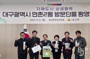 브릿지저널 김진석 기자 | 대구 수성구 만촌2동 주민자치위원회는 지난 8일 자매도시인 의성군 춘산면을 방문해 양 지역 간 우호 협력 강화를 위한 교류 활동을 진행했다. 이번 방문은 2023년부터 이어온 양 지역의 자매결연을 기반으로 주민자치 중심의 상생협력을 확대하기 위해 마련된 것으로, 주민자치위원과 12개 협력 단체 회원 등 30여 명이 참석했다. 방문단은 지난달 개소한 춘산어울림공간에서 공식 환영 행사와 시설 관람을 진행하며 교류의 의미를 나눴고, 향후 협력 확대 방안도 함께 논의했다. 또한 양 지역의 특색을 담은 기념품 교환도 이뤄졌다. 만촌2동은 수성구 대표 캐릭터 ‘뚜비’ 인형과 지역 전통주 ‘느지골 오양주’를 전달했으며, 춘산면은 목재문화체험장에서 제작한 냄비 받침과 금성농협 압맥을 선물하며 따뜻한 환대의 뜻을 전했다. 박영환 주민자치위원장은 “2023년부터 이어온 두 지역의 인연이 해를 거듭할수록 더욱 깊어지고 있어 뜻깊다”며 “앞으로도 주민 중심의 실질적 상생협력이 지속될 수 있도록 적극적인 교류 활동을 이어가겠다”고 말했다. 만촌2동과 춘산면은 앞으로 주민