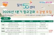 브릿지저널 김진석 기자 | 대구 달서구는 12월 15일부터 24일까지 ‘2026년 1분기 달서50플러스센터 정규강좌’ 수강생을 선착순 모집한다. 달서50플러스센터는 50~64세 세대의 역량 강화와 자기계발을 지원하기 위한 평생교육 기관으로, 매 분기 다양한 교육 프로그램을 운영하고 있다. 이번 1분기에는 ▲자격증 ▲디지털 ▲어학 ▲음악·미술 ▲기획특강 등 9개 분야 총 28개 강좌가 개설된다. 교육은 2026년 1월 12일부터 3월 30일까지 강좌별 10주 과정으로 진행되며, 수강생들의 관심과 요구를 반영해 디지털·어학 분야와 직장인을 위한 야간 강좌가 확대 운영될 예정이다. 신청 대상은 주민등록상 달서구에 거주하는 50~64세 주민(50플러스세대)이며, 수강료는 전 과정 무료다. 수강 신청은 인터넷 접수 또는 전화 접수로 가능하며, 자세한 내용은 구청 홈페이지 통합예약 시스템 또는 달서50플러스센터를 통해 확인할 수 있다. 이태훈 달서구청장은 “이번 교육 프로그램을 통해 지역의 50플러스세대가 더욱 건강하고 즐겁게, 자기 주도적인 삶을 살아가는 데 도움이 되기를 바란다”