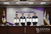 브릿지저널 윤나영 기자 | 원주시는 27일 오전 11시, 강원특별자치도청 신관 2층 소회의실에서 원강수 시장, 김진태 도지사, 이명심 로로에프엔비㈜ 상무이사, 정동인 ㈜수반에이치앤비 대표이사 등이 참석한 가운데 원주 공장 신설을 위한 투자협약을 체결했다. 이번 협약을 통해 두 기업은 원주 문막반계산업단지와 기업도시에 제조공장을 설립하고, 원주시는 기업의 원활한 투자활동을 위해 행·재정적으로 지원할 방침이다. 로로에프엔비는 원주시 부론면에 소재한 프리미엄 디저트 전문 브랜드로, 자체 브랜드 ‘로로멜로(ROROMALLO)’를 출시하며 ‘프로즌스모어’, ‘아이스브륄레’등 차별화된 100% 수제 프리미엄 디저트를 선보여 소비자와 업계의 큰 관심을 받고 있다. 마켓컬리, GS25, CU, 세븐일레븐 등 다양한 유통채널과의 협업을 확장하고 있으며, 아시아 국가를 대상으로 수출을 확대하는 등 늘어나는 수요에 대응하기 위해 제조공장 신설 투자를 결정했다. 2027년까지 문막반계산업단지(8,214㎡)에 134억 원을 투입해 제조공장을 신설하고, 203명을 신규 고용할 계획이다. ㈜수반에이치앤비는 화장품·건강기능
