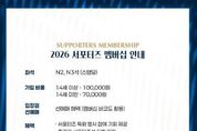 브릿지저널 정보영 기자 | 김천상무 공식 서포터즈 ‘수사불패’가 멤버십 회원을 모집한다. 김천상무 공식 서포터즈 수사불패가 1월 28일부터 시즌 종료 시까지 ‘2026 서포터즈 멤버십’ 회원을 모집한다. 멤버십은 선착순 200명 한정으로 운영되며, 가입비는 14세 이상 10만 원, 14세 미만 7만 원이다. 이번 서포터즈 멤버십은 ‘역대급 혜택’으로 구성됐다. 먼저 멤버십 회원은 김천상무 홈경기 시 선수들과 가장 가까운 곳에서 응원의 열기를 느낄 수 있는 서포터즈석(N2, N3구역) 입장권을 정액 7천 원에 구매할 수 있다. 동시에 가입회원 본인에 한해 서포터즈석 선예매가 가능하다. 다양한 이벤트 혜택도 있다. 서포터즈 특화 행사 참여 기회가 제공되며, 홈경기 서포터즈석 티켓 지원, 원정경기 티켓 일부 지원 혜택도 받을 수 있다. 멤버십 패키지 구성 또한 풍성하다. 서포터즈를 형상화한 멤버십 실물카드와 랜야드가 기본으로 제공되며, 14세 이상 가입자는 구단 공식 의류 후원사 켈미 바람막이를 받을 수 있다. 14세 미만 가입자