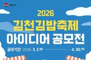 브릿지저널 정보영 기자 | 김천시는 국민과 함께 만들어가는 참여형 축제를 위해 ‘2026 김천김밥축제 아이디어 공모전’을 개최한다. 이번 공모전은 김천김밥축제를 더욱 참신하고 경쟁력 있는 축제로 발전시키기 위해 국민의 창의적인 아이디어를 발굴하고, 우수 콘텐츠를 실제 축제 프로그램에 반영하고자 마련됐다. 공모 기간은 3월 3일부터 4월 30일까지이며, 대한민국 국민 누구나 참여할 수 있다. 공모 주제는‘김밥’을 소재로 한 축제콘텐츠 아이디어로, ▲체험·참여 프로그램 ▲이색 테마존 및 공간연출 ▲어린이·가족·MZ세대·외국인 대상 맞춤형 콘텐츠 ▲지역 관광자원과 연계한 프로그램 ▲캐릭터 굿즈 및 브랜드 확장 등 다양한 분야에서 자유롭게 제안할 수 있다. 접수된 아이디어는 전문가 심사(80%)와 일반인 온라인 심사(20%)를 거쳐 총 10개 아이디어를 선정하며, 수상자에게는 상장과 함께 최우수상 100만 원 등 총 510만 원 규모의 시상금이 수여된다. 선정된 아이디어는 검토를 거쳐 실제 축제 현장에 반영될 예정이다. 김천시는 이번 공모전을 통해 국민이 직접 참여하고 아이디어를 제안하는 개