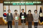 브릿지저널 김경미 기자 | 의정부시의회 ‘의정부시 노인사회참여 연구회’가 18일 연구용역 최종 결과를 집행부에 전달했다. 의정부시 노인사회참여 연구회는 조세일 대표의원과 김연균 의원, 정미영 의원으로 구성된 의원 연구단체로, 노인의 사회참여 현황과 효과를 분석하고 지역 맞춤형 정책 방안을 제시함으로써 노인의 삶의 질 향상과 세대 통합, 지역 공동체 회복을 위해 지난 5월부터 연구 활동을 돌입해 11월 연구 용역을 마쳤다. 연구회는 노인 관련 총괄 부서인 노인복지과에 노인의 사회참여 유형을 분류하고 방안을 제시하는 등에 대한 연구 결과를 토대로 작성된 연구용역 결과 보고서를 전달했다. 조세일 대표의원은 “이번 연구 결과를 바탕으로 담당부서와 협력하고 소통하여 노인사회참여 방안을 실체화하고 추진해 나갈 예정이다”라며, “고령사회 속에서 다양한 세대가 함께 공존할 수 있는 기반이 조성되길 바란다”라고 밝혔다.