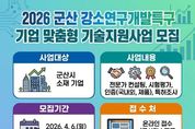브릿지저널 윤나영 기자 | 군산시는 관내 기업의 기술 경쟁력 강화를 위해 ‘2026년 군산 강소연구개발특구 기업 성장단계별 기술지원사업’을 본격 추진한다고 밝혔다. 이번 사업은 중소기업이 창업 초기 단계부터 성장 단계별로 겪는 다양한 애로사항을 해결하고, 각 단계에서 가장 필요한 맞춤형 기술지원을 제공하기 위해 마련됐다. 지원 분야는 ▲중 단기 컨설팅 ▲시험평가 ▲국내외 인증 ▲제품인증 ▲특허조 사 등으로 구성되며, 기업의 성장단계와 필요에 따라 맞춤형 지원을 신청할 수 있다. 특히, 전문가 컨설팅의 경우 기술개발 및 판로개척 자문, 경영 개선을 돕는 단기 과정부터 국가과제 사업계획 수립, 사업기획 지원 등 심화 컨설팅이 필요한 중기과정까지 기업별 상황에 따라 세분화하여 운영된다. 또한, 제품의 성능과 안전성을 검증하는 시험평가를 비롯해 국내·외 일반 인증 및 대규모 비용이 소요되는 제품인증을 지원하여 기업의 시장 진출을 적극적으로 뒷받침할 예정이다. 아울러, 특허 출원을 위한 선행 기술조사·분석을 지원하여 기업의 지식재산권 확보도 지원할 계획이다. 지원 대상은 군산시 소