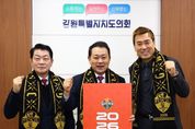 브릿지저널 윤나영 기자 | 강원특별자치도의회는 2026년 강원FC의 선전과 도내 축구 열기 확산을 위해 ‘시즌권 구매-기부 릴레이’에 동참한다. 강원특별자치도의회 의장 김시성과 김병지 강원FC 대표이사는 1월 14일 도의회 의장 집무실에서 강원FC 시즌권 구매-기부 릴레이를 진행했다. 이번 릴레이를 통해 강원특별자치도의회 명의로 기부된 시즌권은 평소 프로축구를 접하기 어려운 아동과 청소년에게 전달되어 도민 화합과 축구 저변확대에 기여할 것으로 기대된다. 도의회 김시성 의장은 “올 한해도 강원FC가 한 단계 더 도약하고 성장할수 있도록 지속적인 관심을 기울이겠다”며, “강원FC가 도민들에게 화합과 행복을 주는 구단으로 발전하기를 응원한다”고 말했다.