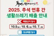 브릿지저널 윤나영 기자 | 태백시는 추석 연휴 기간 원활한 생활폐기물 수거와 쾌적한 도시 환경 유지를 위해 연휴 전인 10월 3일·4일, 연휴 후인 8일·9일에 생활폐기물을 정상 수거한다고 밝혔다. 연휴 동안에는 배출일을 반드시 준수해야 하며, 특히 단독주택 지역은 장기간 방치로 인한 악취와 환경오염이 발생하지 않도록 각별한 주의가 요구된다. 또한, 시는 10월 3일부터 9일까지 ‘생활폐기물 대책상황반’과 기동처리반(생활환경팀 )을 운영해 불법 투기 및 관련 민원에 신속히 대응할 방침이다. 태백시 관계자는 “시민 여러분의 작은 협조가 더 깨끗한 명절을 만드는 힘이 된다”며 “생활폐기물은 3·4일과 8·9일 정상 수거가 이뤄지니 반드시 기억해 주시기 바란다”고 말했다.