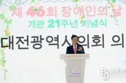 브릿지저널 정보영 기자 | 대전시의회 조원휘 의장은 9일 제46회 장애인의 날 및 유성구장애인종합복지관 21주년 기념식에 참석해 장애에 대한 편견을 허물고 지역 공동체의 결속을 다지는 계기를 마련했다. 이날 행사에는 장애인 가족과 자원봉사자, 후원기관 관계자 등 800여 명이 참석했으며, 식전공연을 시작으로 유공자 시상, 경품추첨, 기념품 증정까지 다채로운 프로그램으로 꾸며졌다. 조원휘 의장은 축사를 통해 "표창을 받으신 분들의 미소에서 대전의 희망을 보았다"며 "대전시민 100명 중 5명, 유성구에만 만 이천여 명의 구민이 장애와 함께 살아가고 계신다"고 말했다. 이어 "장애는 약 88%가 후천적 원인인 만큼, 장애인 복지는 특정 누군가의 문제가 아닌 우리 모두의 내일을 준비하는 일"이라고 강조했다. 또한 "여러분이 행복해야 대전이 행복하다"며 "시의회는 누구도 소외되지 않는 '평등한 대전'을 위해 든든한 동행자가 되겠다"고 밝혔다.