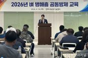 브릿지저널 김경미 기자 | 진주시는 16일 오후 농업기술센터에서 벼 병해충 피해를 최소화하고 체계적인 공동방제를 추진하기 위해 ‘2026년 벼 병해충 공동방제 교육’을 실시했다고 밝혔다. 이번 교육은 진주시농업기술센터가 본격적인 방제 시기를 앞두고 안전하고 효율적인 공동방제 추진을 위해 마련됐으며, 관내 들녘 별 공동방제 보조 사업자와 항공방제사 등 100여 명이 참석한 가운데 실무 중심의 교육으로 진행됐다, 이날 교육에서는 병해충의 발생 시기별 주요 특징과 효과적인 방제 요령을 비롯해 현장에서 자주 발생하는 민원 사례 등을 중심으로 실질적인 내용을 다뤘다. 또한 농약 사용과 항공방제에 적용되는 관련 법규는 물론 안전관리 지침을 안내하는 등 현장에서 바로 활용할 수 있는 실무 정보를 제공해 호응을 얻었다. 이와 함께 지난해 방제 과정에서 제기된 현장의 애로사항과 개선 사례를 공유하며 참여자들이 경험과 정보를 나누고, 보다 효율적인 방제 방안을 모색하는 시간도 마련됐다. 또한 시는 지난해 가을의 고온과 잦은 비로 볍씨 여뭄이 좋지 않았던 점을 고려해 올해 벼의 안전 육묘를 위한 종자소독과 육묘 관리의