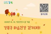 브릿지저널 김경미 기자 | 서울 강북구는 오는 28일 오후 2시부터 4시까지 정신건강의 날 기념 마음건강 걷기대회를 개최한다. 이번 행사는 ‘10월 10일 정신건강의 날’을 기념하여 주민들이 걷기 활동을 통해 일상 속 마음건강을 돌보고, 정신건강의 중요성에 대한 사회적 인식을 높이기 위해 마련됐다. 걷기 코스는 강북구보건소 맞은편 버스정류장에서 출발해 벌리교까지 이어지는 우이천변 1.5km 구간으로, 가을 정취를 느끼며 여유롭게 걷기 활동을 즐길 수 있다. 체험을 통해 정신건강의 중요성을 느낄 수 있도록 풍성한 프로그램도 준비됐다. 주요 프로그램으로는 △마음건강 스탬프 챌린지 △정신건강복지센터 회원들의 작품 전시 △마음건강 포토부스 및 홍보부스 등이 있으며, 행사 참여자와 완주자에게는 소정의 기념품이 제공될 예정이다. 마음건강에 관심 있는 지역주민이면 누구나 걷기대회에 참여할 수 있으며, 모집 인원은 선착순 300명이다. 참가 신청은 24일 오후 6시까지 강북구청 홈페이지 또는 강북구정신건강복지센터를 통해 가능하다. 이순희 강북구청장은 “마음을 돌보는 작은 걸음이 개인의 행복뿐 아니라