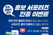 브릿지저널 윤나영 기자 | 전북특별자치도는 전주 하계올림픽 유치를 향한 국민적 관심과 응원을 모으기 위해 다음 달 21일까지 '전주 올림픽 유치 홍보 서포터즈 인증 이벤트'를 진행한다고 1일 밝혔다. 도는 국민과 함께 만들어가는 전주 올림픽 유치를 목표로 지난 8월부터 홍보 서포터즈를 모집·운영 중이다. 약 1,900명이 참여하고 있는 서포터즈는 개인 SNS 등 온라인 채널을 통해 전주 올림픽 유치 소식을 자유롭게 공유하며, 올림픽 개최의 필요성과 의미를 국민에게 널리 전파하는 역할을 담당하고 있다. 이번 인증 이벤트는 서포터즈 가입 후 발급받은 위촉장을 개인 SNS에 지정 해시태그(#전북전주올림픽, #홍보서포터즈, #올림픽유치응원)와 함께 게시하고, 새로 제작된 전주 올림픽 유치 홍보 영상에 '좋아요'와 응원 댓글을 남긴 뒤, 네이버 폼으로 참여 신청을 마치면 된다. 참가자 중 무작위 추첨으로 커피 기프티콘(2만원권 100명, 1만원권 200명) 등 총 300명에게 경품을 증정한다. 또한 서포터즈 활동 실적을 종합 평가해 우수 활동자를 선발하고, 오는 12월 말 전북특별자치도지사 표창과 기념품을