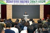 브릿지저널 윤나영 기자 | 정읍시는 15일 농업기술센터에서 2026년도 법무부 배정 농가를 대상으로 외국인 계절근로자 프로그램 사전 교육을 진행했다. 이날 교육에는 지난 12월 말 법무부로부터 외국인 계절근로자 배정을 승인받은 농가주와 각 읍면동 담당 공무원 등 200여 명이 참석했다. 교육은 고용주를 대상으로 찾아가는 농업 노무 교육인 ‘노무랑 농부랑’ 프로그램을 비롯해 외국인 계절근로자 사업의 전반적인 취지와 올해 달라지는 주요 개정 사항을 안내하는 순서로 진행됐다. 특히 시는 고용주가 반드시 지켜야 할 근로시간 준수와 적정한 주거 환경 제공 등 인권 친화적인 고용 환경 조성을 강조했다. 또 무단이탈 발생 시 조치 사항 등 현장에서 발생할 수 있는 문제들에 대한 대응 매뉴얼도 공유했다. 시는 이번 교육을 통해 고용 농가의 제도 이해도를 높이고 현장의 건의 사항과 애로사항을 면밀히 청취해 정책에 반영할 계획이다. 이를 통해 안정적인 인력 운영을 돕고 고용주와 근로자가 서로 존중하는 선진적인 근로 문화를 정착시킨다는 방침이다. 이학수 시장은 “외국인 계절근로자