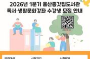 브릿지저널 윤나영 기자 | 울산 중구에서 운영하는 울산종갓집도서관이 2026년 1분기 독서·생활문화강좌 수강생을 모집한다 울산종갓집도서관은 오는 1월 27일부터 3월 28일까지 △금융 △외국어 회화 △생성형 인공지능 활용 △독서교육 △미술 △요가 △필라테스 △유아 발레 등 다양한 연령층을 위한 독서·생활문화강좌 25개를 운영할 계획이다. 이번 분기부터 '울산광역시 중구 공공도서관 설치 및 운영 조례' 개정에 따라 독서문화강좌는 무료, 생활문화강좌는 유료로 운영된다. 생활문화강좌 수강료는 분기별로 주 1회 운영 강좌의 경우 15,000원, 주 2회 운영 강좌의 경우 30,000원이다. 재료비는 별도이며 준비물은 개별로 지참해야 한다. 수강생 모집은 오는 1월 20일 오전 10시부터 중구 구립도서관 누리집을 통해 선착순으로 진행된다. 모집 인원은 380여 명으로, 중구 구립도서관 회원 누구나 신청할 수 있다. 자세한 사항은 중구 구립도서관 누리집을 참고하거나 울산종갓집도서관으로 문의하면 된다. 중구 관계자는 “주민들의 수요를 반영해 더욱 내실 있고 알찬