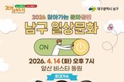 브릿지저널 김진석 기자 | 대구 남구는 지역 주민들에게 일상 속 문화 향유 기회를 확대하고, 지역 예술가들의 공연 활동을 지원하기 위해 ‘2026 찾아가는 문화공연’ 을 개최한다. 관내 신규 입주 공동주택을 대상으로 공연을 희망하는 아파트 단지를 선정하였으며, 오는 4월 14일(화) 앞산비스타동원 아파트에서 첫 공연을 진행할 예정이다. 저녁 7시에 열리는 ‘앞산비스타동원 음악회’에서는 인기 개그맨 김재롱이 사회를 맡고, 지역 가수 이새벽과 미스트롯 4 출연자 장혜리 가수가 공연을 펼친다. 또한, 아파트 입주 후 처음으로 열리는 주민 참여 행사인만큼 입주자 대표회에서도 다양한 경품과 선물을 준비하여 주민 화합의 장을 만들 예정이다. 조재구 남구청장은 “대규모 축제나 행사도 중요하지만, 주민들이 사는 가까운 동네에서 편하게 문화예술을 접할 수 있도록 찾아가는 문화행정을 적극 추진하겠다.”라며, “아파트로 찾아가는 음악회를 통해 주민들이 일상에서 소소한 행복을 느끼며 힐링할 수 있기를 바란다.”라고 전했다. ‘찾아가는 문화공연’에 대한 문의는 남구 문화관광과 문화예술팀으로 연락하면 안내받을 수 있다.