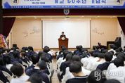 브릿지저널 김경미 기자 | 충북 보은군은 보은고등학교 개교 50주년을 맞아 6일 보은고등학교 현송관에서 열린 기념식에 함께해 학교의 반세기 역사를 기념했다. 이날 기념식에는 최재형 보은군수를 비롯해 보은군의회 의장, 보은교육장, 보은경찰서장, 동문, 학생, 학부모, 지역주민 등이 참석해 보은고등학교의 50년 발자취를 되돌아보고 미래 발전을 기원했다. 행사는 국민의례를 시작으로 학교 연혁 보고, 윤여찬 교장의 기념사, 내빈 축사, 공로자 및 학교 발전 기여자 감사패 수여, 개교 50주년 기념 영상 상영, 교가 제창 순으로 진행됐다. 1976년 3월 6일 개교한 보은고등학교는 현재 241명의 학생과 28명의 교원이 함께하며 지역 교육의 한 축을 담당하고 있다. 지난 반세기 동안 수많은 졸업생을 배출하며 지역사회 발전을 이끌 인재를 길러낸 보은을 대표하는 인재 양성의 산실로 자리매김해 왔다. 윤여찬 교장은 “보은고등학교가 오늘의 50주년을 맞기까지 학교를 아끼고 응원해 준 동문과 지역사회, 학부모 여러분의 관심과 성원이 큰 힘이 됐다”며 “앞으로도 전통을 바탕으로 미래를 준비하며 학생들이 지