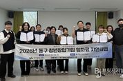 브릿지저널 김진석 기자 | 대구 동구청은 지난달 31일 동구청년센터에서 ‘청년 창업기업 사무실 임차료 지원사업’ 선정 기업들과 협약을 체결하고 본격적인 지원에 나섰다. 임차료 지원사업은 공모를 통해 관내 7년 이내 초기 창업기업 9개사를 최종 선정했으며, 선정 기업들은 최대 10개월간 50만원 한도 내에서 월 임차료의 50%를 지원받게 된다. 임차료 지원 사업은 아이디어와 기술력을 보유하고도 초기 자본 부족과 고정비 부담으로 어려움을 겪는 청년 창업가들에게 월 임차료의 일정 부분을 지원해 폐업률을 낮추고 성장을 돕는 맞춤형 지원 정책이다. 지난해 처음 시행돼 15개 창업기업을 지원했으며, 청년 창업가들이 절감된 비용을 사업에 재투자해 기업 경쟁력을 강화하기도 했다. 김태운 동구청장 권한대행은 “청년들이 우리 지역 사회에 안착하고 성공적인 창업가로 성장할 수 있도록 꾸준히 돕겠다”고 말했다.