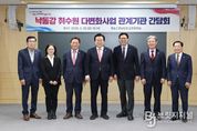 브릿지저널 윤나영 기자 | 부산시는 어제(20일) 오후 4시 경상남도청 도정회의실에서 개최된 '낙동강 취수원 다변화사업 관계기관 간담회'에서 물 문제 해결을 위한 의미있는 논의를 진행했다고 밝혔다. 간담회에는 박형준 부산시장, 박완수 경상남도지사, 박상웅 국회의원, 의령군수, 창녕군수, 기후에너지환경부 물이용정책관, 창녕군 반대대책위원장 등 총 7명이 참석하여 사업 전반과 주민 우려사항을 심도 있게 논의했다. 또한 합천군을 비롯해 수혜 지역인 창원시·양산시·함안시·김해시 부단체장이 배석하는 등 관련 지자체가 모두 함께해 자리를 더욱 뜻깊게 했다. 이번 간담회는 ▲[기후에너지환경부] 낙동강 취수원 다변화사업 추진상황 보고 ▲[부산시] 취수지역 상생협력방안 보고 ▲[토론] 질의응답 및 기관별 입장 공유 순으로 진행됐다. 기후부는 낙동강 취수원 다변화사업 추진상황을 그동안 반대대책위원회가 제시한 주요질의에 대한 응답 형식으로, ▲지점별 취수계획 ▲지하수위 영향범위 ▲지하수위 감소 대책 ▲손실보상 방안 등을 설명했다. 부산시는 ▲부산-창녕 상생발전기금 조성 ▲창녕군 출신 학생 장학금·기숙사 지