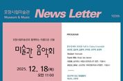 브릿지저널 정보영 기자 | 포항시립미술관은 오는 18일 오전 11시, 제103회 미술관 음악회 ‘MUSEUM · MUSIC’를 개최한다. 이번 음악회는 2025년 마지막 음악회로, 크리스마스와 연말 분위기에 어울리는 다채로운 음악 프로그램을 마련해 시민들에게 따뜻한 문화 향유의 시간을 선사할 예정이다. 미술관 음악회는 2014년부터 ‘문화가 있는 날’과 연계해 정기적으로 운영되고 있는 포항시립미술관의 대표 문화 프로그램이다. 전시 감상과 공연을 결합한 복합 문화 향유 모델로 자리 잡았으며, 매월 다양한 장르의 음악을 선보여 시민들이 일상 속에서 예술을 가까이 접할 수 있도록 하고 지역 문화예술 활성화에도 꾸준히 기여해 왔다. 이번 제103회 음악회는 지역 기반 생활예술단체와 시민 예술인이 함께하는 공연으로 기획됐다. 클래식 기타 앙상블 ‘폴인클래타(Fall in Clatta)’를 중심으로 혼성 포크기타 듀오 ‘로얄젤리’, 하모니카와 팬플룻 협연, 싱어송라이터 공연까지 어우러진 다(多)장르 구성으로 세대와 취향을 아우르는 무대를 선보인다. 공연의 문을 여는 폴인클래타 앙상블