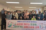 브릿지저널 김경미 기자 | 김해시도시개발공사 해동이국민체육센터는 지난 16일 관내 발달장애인 주간보호센터인 ‘와락 사회적협동조합’을 방문해 ‘기초 응급처치 및 심폐소생술(CPR) 교육’을 실시했다. 이번 교육은 생활 속 위급 상황 대처 능력을 키우고 생명 존중 문화를 확산하기 위해 마련됐다. 교육 내용으로는 ▲응급 상황 시 주변 도움 요청법 ▲정확한 119 신고 요령 ▲환자 의식 확인 방법 ▲심폐소생술(CPR) 기본 절차 ▲자동심장충격기(AED) 사용 방법 등 발달장애인 눈높이에 맞춘 핵심 필수 단계들로 구성됐다. 이날 교육은 이론 위주의 강의에서 벗어나, 위급 상황 발생 시 누구나 즉각적으로 대응할 수 있도록 장애인 맞춤 방식으로 운영되어 참여자들의 큰 호응을 얻었다. 특히 이번 프로그램은 센터 장애인 수영 지도자들의 재능기부로 진행되어 그 의미를 더했다. 장애인과 비장애인이 함께 안전한 지역사회를 만드는 데 힘을 보태며 사회적 가치를 실현하는 계기가 됐다는 평가를 받는다. 센터 관계자는 “이번 교육을 통해 장애인들이 응급 상황에서도 당황하지 않고 ‘4분의 기적’을 실천할 수 있는