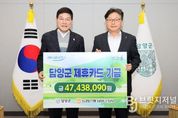 브릿지저널 김경미 기자 | 담양군은 18일 군청에서 NH농협 제휴카드 적립기금 전달식을 개최했다. 이번에 전달된 적립기금은 약 4,700여만 원으로, 담양군과 NH농협 간 제휴카드 협약에 따라 조성됐다. 이 기금은 카드 이용 실적에 따라 NH농협에서 조성해 매년 담양군에 전달하는 것으로, 군이 지난 한 해 공무 수행에 사용한 보조금 전용카드와 소속 공무원의 복지카드, 각종 단체에서 발급한 보조금 카드 이용 금액의 0.1~1.0%가 포인트로 적립돼 마련됐다. 군은 전달받은 기금을 세입 처리해 지역사회 발전과 군민 복리 증진을 위한 재원으로 활용할 계획이다. 정철원 군수는 “NH농협과의 협력을 통해 조성된 소중한 기금인 만큼 군민 복리 증진과 지역 발전을 위해 의미 있게 사용하겠다”며 “앞으로도 NH농협 담양군지부가 지역사회와 상생하며 함께 발전해 나가길 기대한다”라고 말했다.