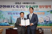 브릿지저널 김경미 기자 | 충북 진천군은 군청 소회의실에서 HR레포츠 주식회사(대표 신호룡)와 ‘진천 HR FC 축구단 육성 및 지원을 위한 업무협약’을 체결했다고 24일 밝혔다. 이번 협약은 2026년 대한축구협회 K4 리그 참가를 앞두고, 진천 HR FC의 안정적인 운영 기반을 마련하고, 지역 스포츠 발전을 위한 협력 체계를 구축하기 위해 추진됐다. 협약식에는 송기섭 진천군수와 HR레포츠(주) 신호룡 대표, 김화영 진천군 체육회장, 김중기 진천군 축구협회장 등 관계자들이 참석했다. 협약의 주요 내용은 △축구단 운영과 발전 지원 △유소년 축구 육성과 저변 확대 △지역사회 공헌 활동 △스포츠마케팅을 통한 지역 홍보 강화 등이다. 군은 이번 협약을 통해 지역 스포츠 브랜드 가치 제고, 군민 스포츠 관람 문화 정착, 유소년·생활 체육 연계 강화 등 다양한 효과를 기대하고 있다. 앞으로 군은 행정적·재정적 지원과 경기장 관련 시설 활용 지원 등에 협력하고, HR 레포츠는 선수단 운영, 스포츠마케팅, 유소년 프로그램 운영 등을 총괄하며 지역 축구 문화 확산에 힘쓸 예정이다. 송