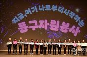 브릿지저널 김진석 기자 | 2025년 동구자원봉사자대회가 지난 16일 아양아트센터에서 개최됐다. ‘지금 여기, 나로부터 시작하는 자원봉사!’라는 슬로건으로 진행된 이날 행사는 600여명의 자원봉사단체 회원들이 한자리에 모여 축하공연, 영상 상영, 자원봉사 유공자 표창 등의 순서로 진행됐다. 홍창식 동구자원봉사센터 이사장은 “올 한 해 동안 우리 지역 곳곳에서 따뜻한 손길을 내밀고, 보이지 않는 곳에서 묵묵히 빛이 되어주신 자원봉사자 여러분께 감사의 마음을 전하며, 2026년에도 행복과 희망을 주는 동구자원봉사센터가 되기 위해 최선의 노력을 다하겠다”고 말했다. 윤석준 동구청장은 “2025년 한 해 동안 보여주신 자원봉사자 여러분의 헌신에 깊이 감사드리며, 이 행사를 통해 지역사회에 자원봉사가 더욱 확산되고, 나눔의 문화가 생활 속에 정착되는 계기가 되길 바란다”고 했다.