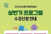 브릿지저널 김경미 기자 | 인천시 남동구 평생학습관은 구민의 자기 계발과 지적 성장을 위해 오는 24일부터 ‘2026년 상반기 평생학습 프로그램’ 학습자를 모집한다고 20일 전했다. 상반기 프로그램은 3~5월까지 운영되며, 일상의 활력을 더하고 실질적인 역량을 강화할 수 있는 실용적인 강좌들로 꾸려졌다. 특히, ‘2025년 평생교육 강사학교’ 과정을 이수한 강사들이 지역사회와 시민의 삶을 주제로 직접 기획⋅개발한 강좌들이 다수 개설됐다. 주요 강좌로는 ▲남동구의 색(色)다른 이야기 ▲나의 감정을 안아주는 예술이야기 ▲생성형 AI로 만드는 나의 영상 콘텐츠 ▲그림책과 공예 테라피로 나를 찾는 ‘다시, 봄’ 등 모두 4개 과정이 운영된다. 이와 함께 전 연령층의 학습 수요를 반영한 다양한 강좌도 운영된다. ▲시니어(65+) 스마트폰 입문 클래스 ▲바리스타 2급 자격과정 ▲오뒷세우스 깊게 읽기 ▲장애인과 비장애인이 함께하는 생태탐방 등 실용성과 인문적 소양을 아우르는 프로그램이 준비돼 있다. 수강 신청은 남동구평생학습관 홈페이지에서 선착순으로 진행되며, 남동구민 또는 남동구 내