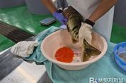 브릿지저널 정보영 기자 | 경상북도 민물고기연구센터는 11월 1일 산란을 위해 울진 왕피천으로 돌아오는 어미연어 첫 포획이 시작되어 본격적인 종자생산 작업에 들어갔다. 이번에 포획된 어미연어는 13마리(암컷 6, 수컷 7), 전장 70㎝급으로, 이곳에서 3~4년 전 방류된 어린 연어가 북태평양을 회유하며 성장한 뒤 왕피천으로 돌아온 개체다. 연구센터는 왕피천 하류에 길이 250m 포획장을 설치해 어미연어를 포획, 채란, 종자를 생산해 내년 봄 60만 마리의 치어를 왕피천에 방류한다. 올해는 10월 지속적인 강수로 인해 포획장 설치 지연으로 첫 포획이 다소 늦어졌으나, 지금부터 주 산란 시기로 목표량 달성에 최선을 다할 예정이다. 아울러 수산 계열 고등학생을 대상으로 채란, 수정, 부화 등 인공부화 전 과정을 체험할 수 있는 현장학습 프로그램도 운영한다. 연어 방류 사업은 하천 개발 등으로 산란장이 훼손되어 연어의 자연 산란이 어려워짐에 따라 경북도에서 1970년부터 이어온 사업으로, 인공부화를 통한 치어방류로 도내에 연어가 회귀하는 하천을 계속 보존하기 위한 중요한 사업이다.