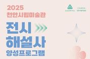 브릿지저널 정보영 기자 | 천안문화재단은 내달 4일부터 ‘2025 전시해설사 양성프로그램’ 참여자를 선착순 모집한다고 31일 밝혔다. 이번 프로그램에서는 작품과 관람객을 이어주는 전시해설사에 대한 이해와 관련 소양을 기르기 위한 이론과 실무 교육이 진행된다. 교육과정은 ▲한국 현대미술의 흐름과 이해(권영진) ▲도슨트 역할과 이해(김혜정) ▲한국근대미술의 흐름과 이해(권행가) ▲도슨트의 스크립트와 스피치(한이준)으로 구성됐다. 교육은 내달 20일부터 12월 11일까지 매주 목요일 오후 2시~ 4시 30분 천안예술의전당 문화센터에서 진행될 예정이다. 지원자격은 2025 전시해설사 양성프로그램에 참여한 경험이 없는 20세 이상 성인으로, 모집 인원은 총 40명이다. 교육과정 3회 이상 수강 시 수료증이 발급되며, 수료자에게는 내년도 천안시립미술관 문화자원봉사 지원 시 가산점이 부여된다. 자세한 내용은 천안시립미술관 누리집을 통해 확인할 수 있으며, 문의사항은 시각예술팀으로 하면 된다.