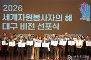 브릿지저널 김진석 기자 | 대구광역시는 3월 23일 오후 2시, iM뱅크 제2본점에서 대구광역시자원봉사센터와 함께 ‘2026년 세계자원봉사자의 해 대구비전 선포식’을 성황리에 개최했다. 이번 선포식은 유엔(UN)이 2001년 이후 25년 만에 다시 지정한 ‘2026 세계자원봉사자의 해’를 맞아 대구만의 차별화된 자원봉사 모델을 구축하고 새로운 도약을 선언하기 위해 마련됐다. 대구시는 전국 최초로 6년 연속 자원봉사 우수도시로 선정되는 등 자원봉사 선도도시로서의 위상을 이어가고 있다. 특히 올해는 전국 최초로 설립된 대구시자원봉사센터가 개소 30주년을 맞는 뜻깊은 해로, 지난 성과를 돌아보고 미래 30년의 청사진을 제시하는 데 중점을 뒀다. 이날 행사에는 안중곤 대구시 행정국장, 윤영애 대구시의회 기획행정위원회 위원장, 홍정우 행정안전부 민간협력공동체과장을 비롯해 한국중앙자원봉사센터 등 100여 개 유관기관 관계자와 자원봉사자 350여 명이 참석했다. 행사는 홍보영상 상영을 시작으로 ▲개회식 ▲비전 선언문 낭독 ▲선포 퍼포먼스 ▲축하공연 순으로 진행됐다. 참석자들은 선언문을 함께 낭독하며 자원봉사의