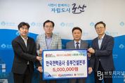 브릿지저널 윤나영 기자 | 한국가스공사 전북지역본부(본부장 조강철)는 24일, 최근 집중호우로 피해를 입은 군산시 저소득 주민들을 위해 성금 1천만 원을 군산시에 기탁했다. 이번 성금은 지난 6일 집중호우로 주택·상가 침수 등의 피해를 본 이재민들을 돕기 위해 마련됐다. 성금은 전북사회복지공동모금회를 통해 관내 저소득계층 중 수해 피해 이재민에게 전달될 예정이다. 조강철 본부장은 “지역사회와 함께하는 나눔은 기업의 중요한 사회적 책임.”이라며, “이번 성금이 피해 주민들에게 작은 힘이 되길 바라며 앞으로도 지속적인 나눔 활동을 이어가겠다.”라고 전했다. 강임준 군산시장은 “어려운 시기에 이웃을 위해 따뜻한 마음을 나눠주신 한국가스공사 전북지역본부 임직원분들께 감사드린다.”라며, “성금은 꼭 필요한 주민들에게 지원되어 회복에 큰 도움이 될 것.”이라고 말했다. 한국가스공사 전북지역본부는 2004년 설립 이후 천연가스 공급을 비롯해 큰들 봉사단을 운영하며 지역사회 봉사활동과 연탄 기부, 사회복지시설 생필품 및 방역물품 지원, 주거환경 개선(LP가스 시설개선·타이머콕 보급사업) 등 다양한 사회공헌 활동을