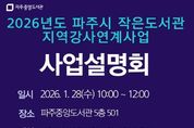 브릿지저널 김경미 기자 | 파주시 중앙도서관은 지역의 작가, 예술가, 독서문화 활동가 등 인재를 발굴해 작은도서관의 독서문화 프로그램을 지원하는 녪년 작은도서관 지역강사 연계사업’에 참여할 지역강사를 모집한다. ‘작은도서관 지역강사 연계사업’은 2021년부터 추진하여 시민들이 작은도서관에서 지역의 작가, 예술가, 독서문화 활동가와 만나 다양한 독서문화 활동을 체험할 수 있도록 지원해 온 인기 사업이다. 특히 2025년에는 약 1,200명의 시민이 참여해 독서문화 확산과 작은도서관 운영 활성화에 크게 기여했다. 오는 28일 10시 중앙도서관에서 참여하고자 하는 강사들을 위해 모집 전 ‘강사 사업설명회’를 개최한다. 설명회에서는 사업 취지와 신청서 작성방법 등을 설명하여, 지역 작가, 예술가, 독서문화 등 다양한 역량을 가진 강사가 참여할 수 있도록 안내할 예정이다. 2026년도 지역강사 연계사업에 참여하여 강사로 활동하고자 하는 인재들은 오는 29일부터 2월 10일까지 신청서를 작성해 제출하면 된다. 또한, 2월 26일에는 서류심사를 통과한 강사를 대상으로 박람회 형식의 프로그램 설명회인 ‘지역강사박