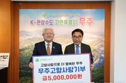브릿지저널 윤나영 기자 | DH그룹(동해금속(주), 나봄리조트 등) 서동해 회장이 지난 24일 무주군에 고향사랑기부금 5백만 원을 기탁했다. 이날 서동해 회장은 "무주군은 나봄리조트를 통해 소중한 인연을 이어가고 있는 곳”이라며 “무주군과의 상생을 위해 앞으로도 세심한 관심을 쏟을 것”이라고 밝혔다. 전북 완주군에 본사를 둔 DH그룹은 주력 사업인 상용차 및 승용차 부품 생산 분야에서 ‘작지만 강한 기업’으로서의 입지를 확고히 하고 있으며 무주군 설천면에서는 나봄리조트를 운영하고 있다. 봉사 경영을 통한 사회 환원에도 적극적인 것으로도 알려진 DH그룹은 2008년에 설립된 '권정순 장학재단'을 통해 저소득층 지원, 청소년 장학사업, 소외된 이웃돕기 등 사회공헌 활동에 연간 3억여 원을 투입하고 있다. 무주군에는 2023년부터 3년간 총 1천1백만 원의 고향사랑기부금을 기탁해 훈훈함을 전하고 있다.