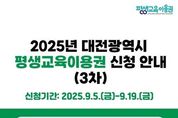 브릿지저널 정보영 기자 | 대전시와 대전평생교육진흥원은 평생교육이용권 지원 대상자 282명을 추가 모집한다고 7일 밝혔다. 신청 기간은 9월 5일부터 19일까지이며, 19세 이상 대전 시민이면 누구나 대전평생교육이용권 홈페이지를 통해 온라인 신청할 수 있다. 이번 추가 모집은 당초 1·2차 모집에서 저소득층을 대상으로 했으나 모집 인원이 채워지지 않아, 남은 자리를 일반 시민에게도 개방해 지원 기회를 넓힌 것이다. 다만 제도의 취지를 고려해 기초생활수급자와 차상위계층은 우선적으로 선발된다. 선정된 시민에게는 NH농협카드에 1인당 35만 원이 포인트로 지급되며, 평생교육기관·직업훈련시설·학원 등에서 강좌 수강료와 교재비로 사용할 수 있다. 자격증 취득, 창업 교육, 어학, 인문학, AI·디지털 분야 등 다양한 프로그램 참여가 가능하다. 단, 국가장학금 수혜자와 올해 1·2차 모집에서 이미 이용권을 받은 시민은 신청 대상에서 제외된다. 대전시는 올해 1차(4월) 1,573명, 2차(6월) 745명을 선정했으며, 이번 추가 모집을 통해 더 많은 시민들이 학습 기회를 누릴 수 있을 것으로 기대하고 있다.