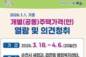 브릿지저널 김경미 기자 | 순천시는 2026년 1월 1일 기준 개별공시지가의 열람 및 의견제출을 3월 18일부터 4월 6일까지 접수한다고 밝혔다. 이번 개별공시지가 열람 대상토지는 30만 5,991필지로, 토지 특성 등을 조사해 산정했으며 가격의 공정성과 객관성을 높이기 위해 감정평가사에게 산정지가의 적정성 여부 등의 철저한 검증 절차를 마쳤다. 개별공시지가 열람은 순천시 토지정보과 및 읍․면․동 행정복지센터를 직접 방문하거나 시 홈페이지 및 부동산공시가격 알리미 등을 통해 확인할 수 있다. 의견이 있는 경우 토지소유자 또는 이해관계자는 의견서를 작성해 방문 또는 우편 제출하거나 국토교통부의 부동산공시가격 알리미 홈페이지를 통해 온라인으로도 접수할 수 있다. 의견이 제출된 필지에 대해서는 토지 특성 및 인근 토지와 지가 균형 등을 검토하고, 감정평가사의 재검증과 순천시 부동산가격공시위원회의 심의를 거쳐 그 결과를 의견 제출자에게 개별 통지하고 개별공시지가는 4월 30일에 결정·공시할 예정이다. 시 관계자는 “개별공시지가는 토지 관련 국세 및 지방세 과세자료와 각종 부담금‧사용료 등의