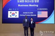 브릿지저널 정보영 기자 | 아산시는 24일 글로벌 첨단 유리소재 선도기업인 코닝정밀소재㈜를 방문해 임직원들과 간담회를 갖고 지역경제 활성화와 상생협력 방안을 논의했다고 밝혔다. 이번 방문은 코닝정밀소재의 생산 현장을 직접 둘러보고, 최근 디스플레이 산업의 기술 변화와 기업 애로사항을 청취하며 지역 산업 생태계와 연계한 협력 방안 및 지역경제 회복 방향을 모색하기 위해 마련됐다. 간담회에는 오세현 시장을 비롯해 이재성 기획경제국장 등 시 관계자와 반 홀(Vaughn M. Hall Jr.) 코닝정밀소재 대표이사와 임원진 등 20여 명이 참석했다. 양측은 △코닝의 첨단 건축용 유리제품 공공건축물 적용 △아산시 관내 기업 이용 및 청년 현장견학 프로그램 운영 △아산페이 더블혜택 이벤트 홍보 △지역 농산물 이용 등 다양한 상생 협력 과제에 대해 의견을 교환했다. 이 자리에서 오 시장은 “디스플레이 산업은 초고해상도, 대형화, 폴더블 등 기술 패러다임이 빠르게 전환되고 있으며, 그 중심에 코닝의 초박막‧고기능성 유리 기술이 있다”고 평가했다. 특히 “코닝정밀소재는 아산의 미래산업을 함께 설계하는