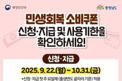 브릿지저널 정보영 기자 | 2차 민생회복 소비쿠폰의 신청 기한이 오는 31일 마감되는 가운데, 충남도가 도내 미신청자에 대해 기한 내 신청·사용할 것을 당부했다. 신청 마감일은 31일 오후 6시로, 기한 내 신청해야 10만 원을 지원받을 수 있다. 민생회복 소비쿠폰은 지역경제에 신속히 활력을 불어넣기 위해 사용기한이 명확히 설정돼 있다. 사용기한은 이미 지급된 1차분과 2차분 모두 다음달 30일까지다. 온오프라인으로 받은 카드 포인트는 기한 내 사용해야 하며, 기한이 지나면 잔액은 자동 소멸한다. 종이형 상품권도 기한이 지나면 사용이 불가하다. 소비쿠폰 통계 시스템 자료에 의하면 도내 1차 온라인 지급분 기준 3280억 원 중 2.5%인 83억여 원이 아직 사용되지 않은 것으로 나타났다. 도의 2차 소비쿠폰 지급률은 24일 기준 96%로, 지급 대상자 중 7만여 명의 도민이 아직 받지 않은 것으로 집계됐다. 도 관계자는 “민생회복 소비쿠폰은 국민의 가계 부담을 덜고 지역경제를 회복하기 위한 실질적 민생 지원 정책”이라며 “신청 마감일은 10월 31일
