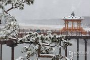 브릿지저널 김경미 기자 | 대설주의보가 내린 24일 하얀 눈이 소복이 내려앉은 충북 괴산군 동진천 옆 소나무길이 겨울 정취를 물씬 풍기고 있다. 내린 눈으로 동진천 산책로와 소나무 가로수길은 순식간에 은빛 풍경으로 변했다. 길게 늘어선 소나무 가지마다 눈꽃이 피어나 장관을 이루고있다